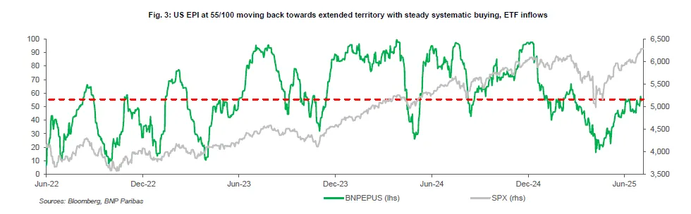 法國巴黎銀行一項涵蓋大宗商品交易顧問、波動率目標基金和對沖基金等投資者的股票倉位指標持續上升,目前已略高於中性水平。此前數月的美股反彈中,標普500指數從熊市邊緣回升至歷史新高。該行數據顯示,機構投資者在上一次劇烈復甦行情中保持如此低倉位還要追溯到2023年。