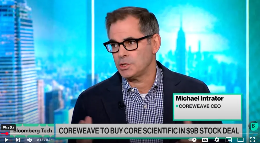 CoreWeave首席執行官邁克爾·因特拉託做客彭博科技,討論其公司擬議收購Core Scientific的90億美元全股票交易。