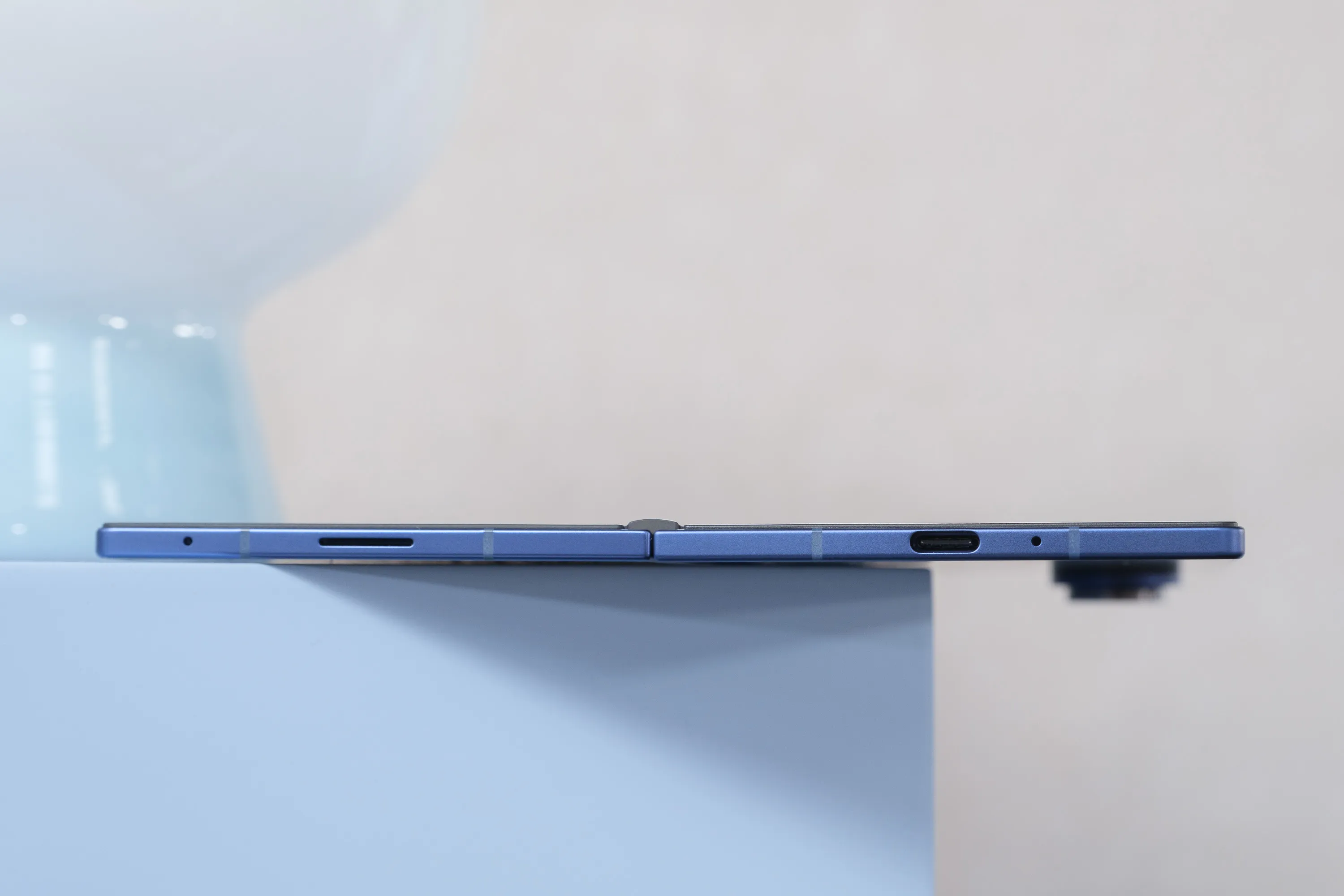 Galaxy Z Fold 7的厚度僅略超過其Type-C接口。攝影師:克里斯·韋爾奇/彭博社Fold 7閉合時厚度僅8.9毫米,相較去年Galaxy Z Fold 6的14.9毫米實現顯著提升,使握持體驗更接近普通手機。相比初代Galaxy Z Fold,厚度縮減了48%。中國品牌榮耀推出的8.8毫米厚的Magic V5仍是目前全球最薄摺疊屏手機,但三星已非常接近這一紀錄。