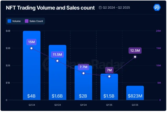 NFT交易平台正演變為更適合散户的主流交易所,這不是宏大設計的結果,而是形勢所迫。追蹤機構Dune數據顯示,NFT交易量在2024年1月達到峯值後急劇下滑,因加密社區多數轉向比特幣和模因幣等加密貨幣。研究機構DappRadar指出,二季度NFT交易額下降45%至8.67億美元,但銷售量激增78%達1490萬筆,“凸顯平均價格暴跌的同時交易者數量增加了20%"。