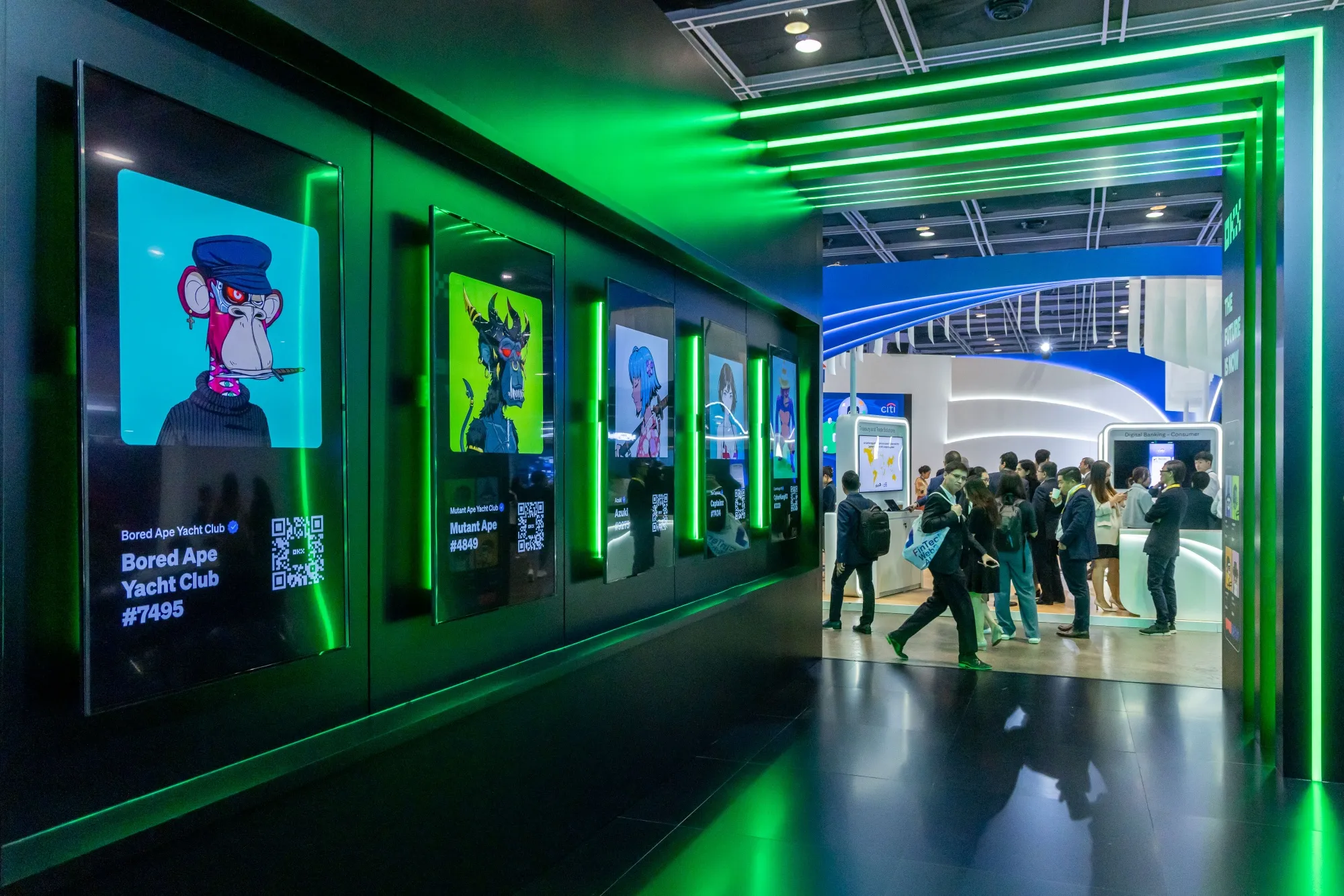 2023年11月香港金融科技周展出的NFT藝術品。攝影師:Paul Yeung/彭博社退場:百萬美元猿猴頭像。入場:模因幣交易——且速度迅猛。