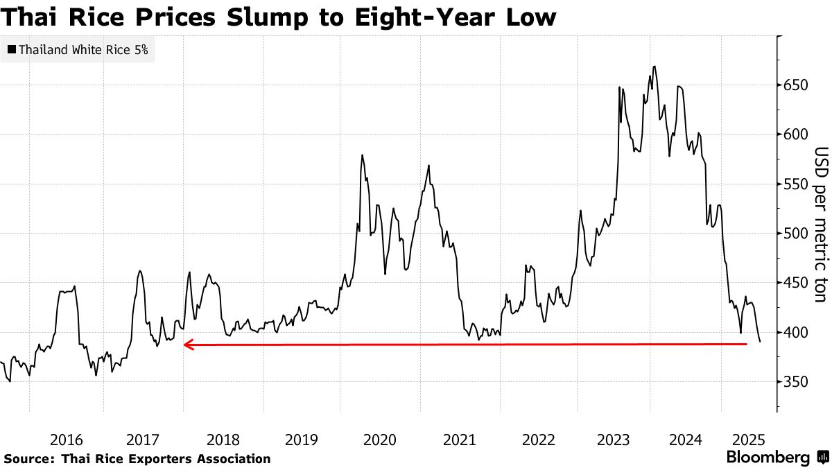 這種穀物是數十億人的飲食支柱,在東南亞部分地區可滿足人們50%的每日熱量攝入。2024年因強勁需求和供應擔憂,米價曾飆升至15年高點,隨着產量回升價格逐步回落。聯合國糧農組織預測,2025-26年度全球大米產量有望創紀錄,推動儲備量增長。