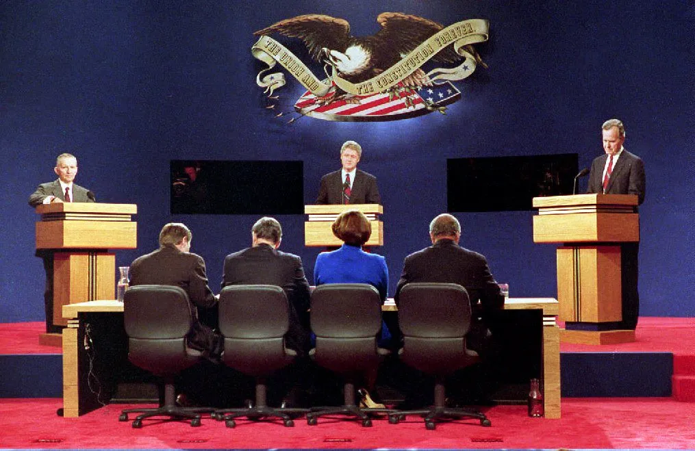 1992年,總統候選人羅斯·佩羅(左)、比爾·克林頓和喬治·布什在辯論中回答問題。攝影師:大衞·阿克/法新社/蓋蒂圖片社1992年,商人羅斯·佩羅以獨立候選人身份競選總統。他在6月前的民調中領先,獲得了所有50個州的選票資格,並贏得了18.9%的普選票。三年後,他成立了改革黨,並在1996年以新黨的名義再次競選總統。儘管他只獲得了8.4%的選票,但這是美國曆史上最成功的第三方努力之一。1998年,前職業摔跤手傑西·文圖拉以改革黨候選人身份當選明尼蘇達州州長。