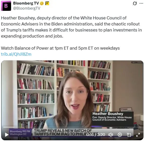 今天下午1點,彭博電視台《權力平衡》早間版節目中,主持人喬·馬修和凱莉·萊茵茨採訪了拜登政府白宮經濟顧問委員會副主任希瑟·布希,探討特朗普關税政策對企業的影響以及他對美聯儲施壓降息的舉措。