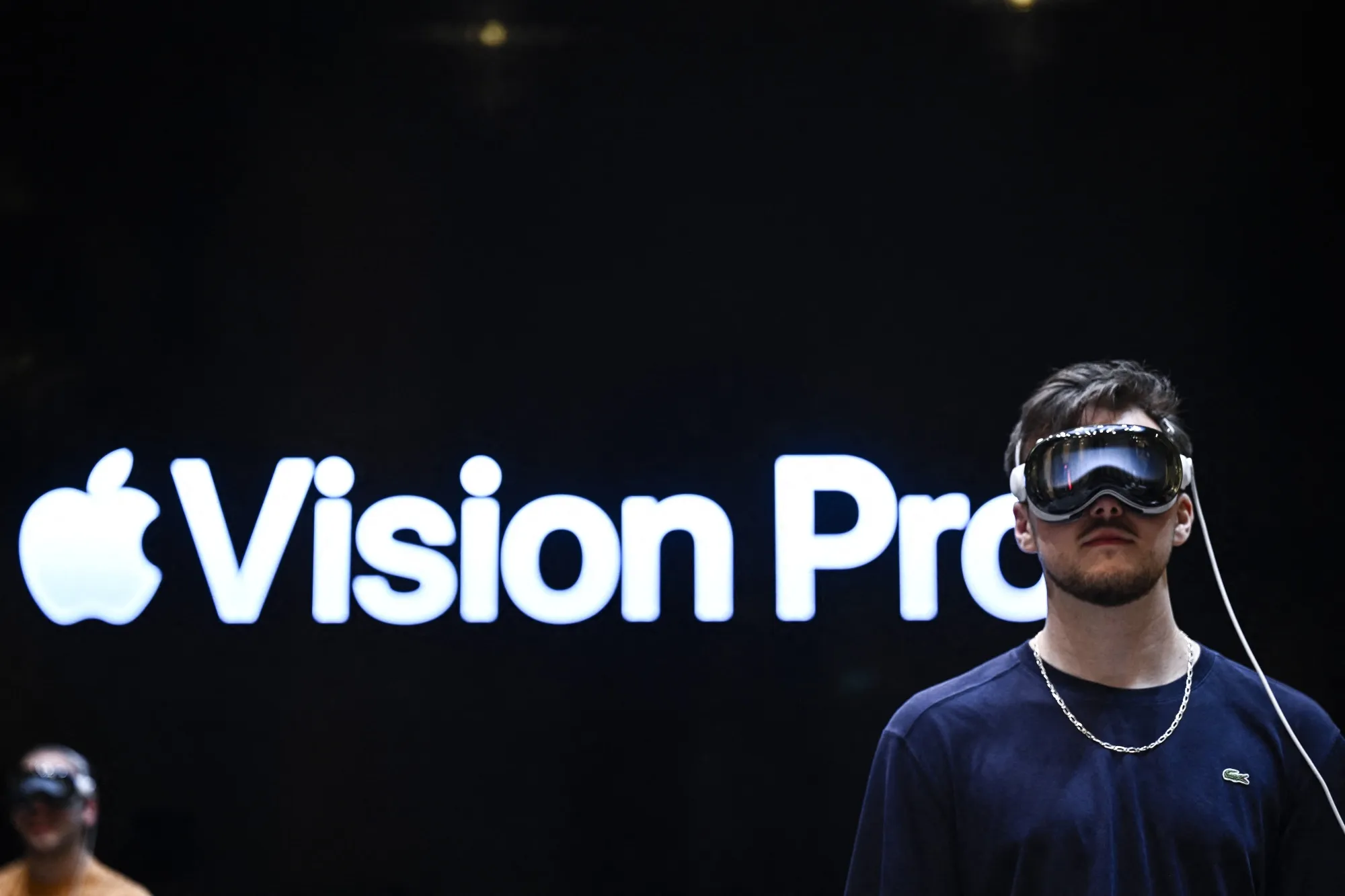 一位顧客正在試用蘋果Vision Pro混合現實眼鏡設備。攝影師:朱利安·德羅薩/法新社