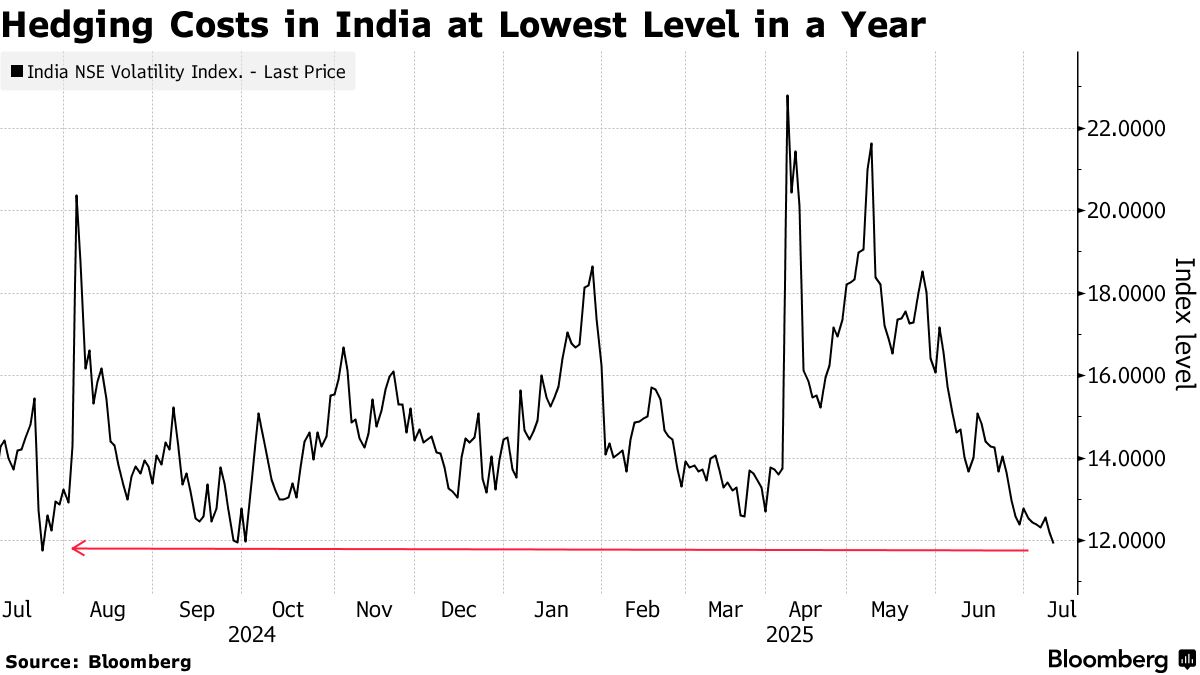 印度的市場情緒保持穩定,印度國家證券交易所波動率指數(又稱恐慌指數)週三跌至近一年來最低點。看來期權交易商並未因市場監管機構對Jane Street交易的調查或美印貿易協定的延遲而預判市場會出現大幅波動。目前投資者似乎保持着冷靜。