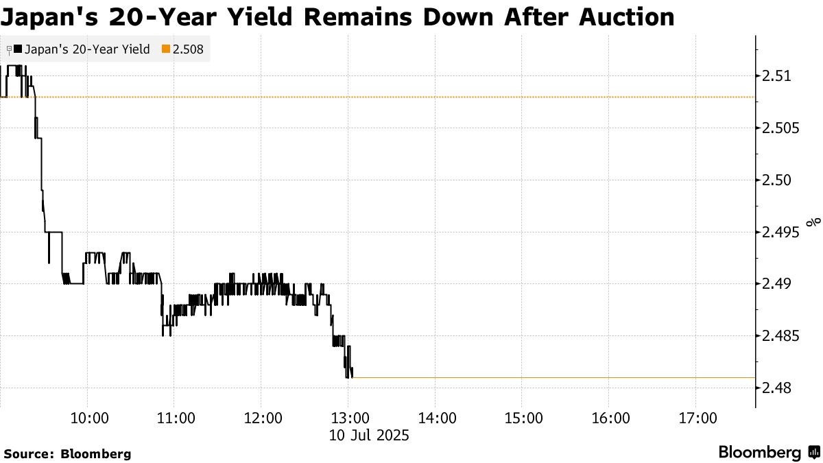“今日20年期國債拍賣結果中性,投標倍數和尾部利差均未顯現明顯疲軟,”SMBC日興證券高級利率策略師Miki Den表示,“除收益率水平更具吸引力外,超長期債券前一日企穩及收益率曲線陡化趨勢暫停,也提升了債券的購買吸引力。”