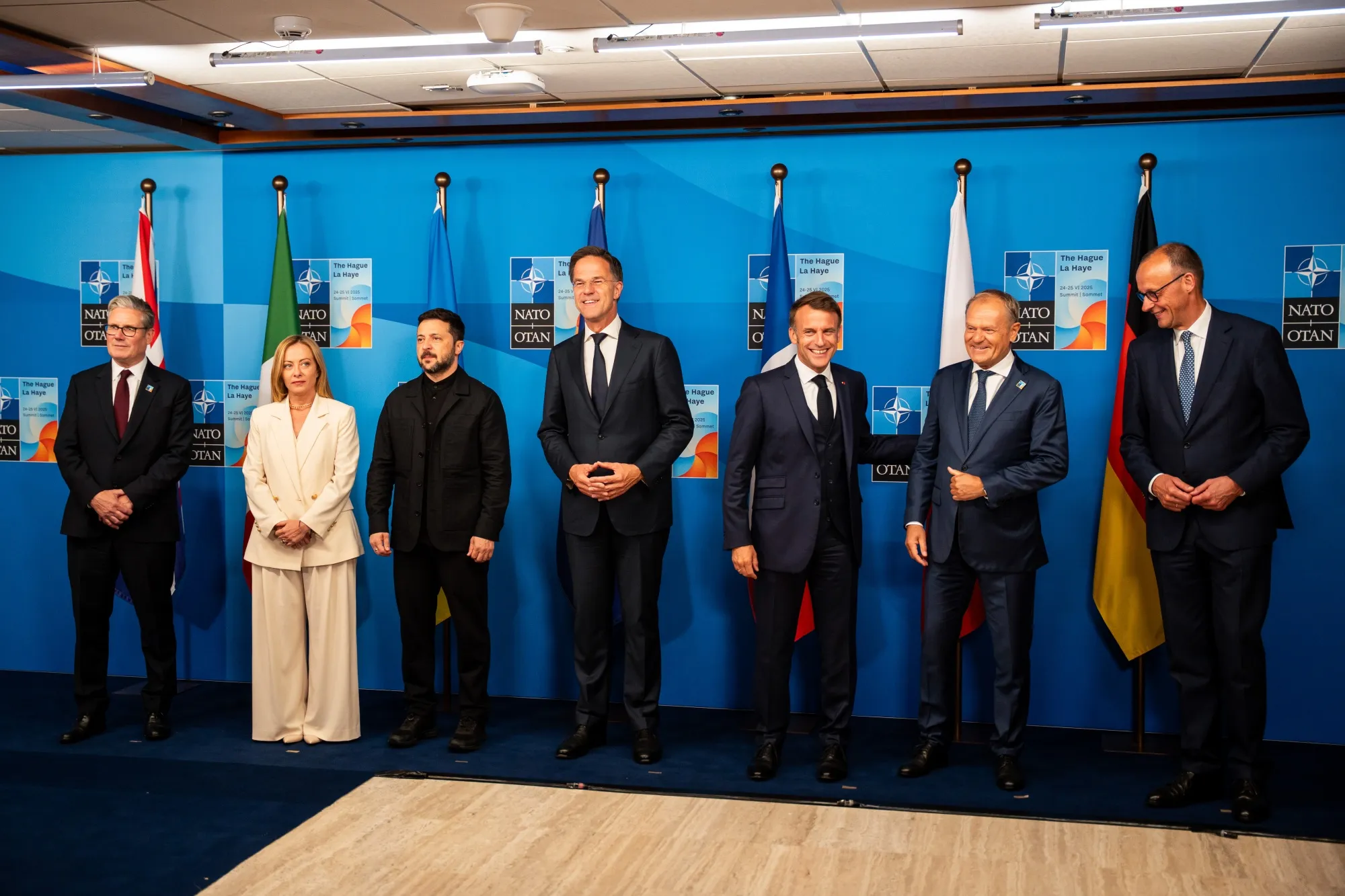 6月24日北約峯會上,從左至右依次為基爾·斯塔默、喬治婭·梅洛尼、弗拉基米爾·澤連斯基、馬克·呂特、埃馬紐埃爾·馬克龍、唐納德·圖斯克和弗里德里希·默茨。攝影師:Lina Selg/Pool/Getty Images聚集在羅馬討論烏克蘭戰後重建的盟國將不得不面對一個現實:這一前景比以往任何時候都更加渺茫。