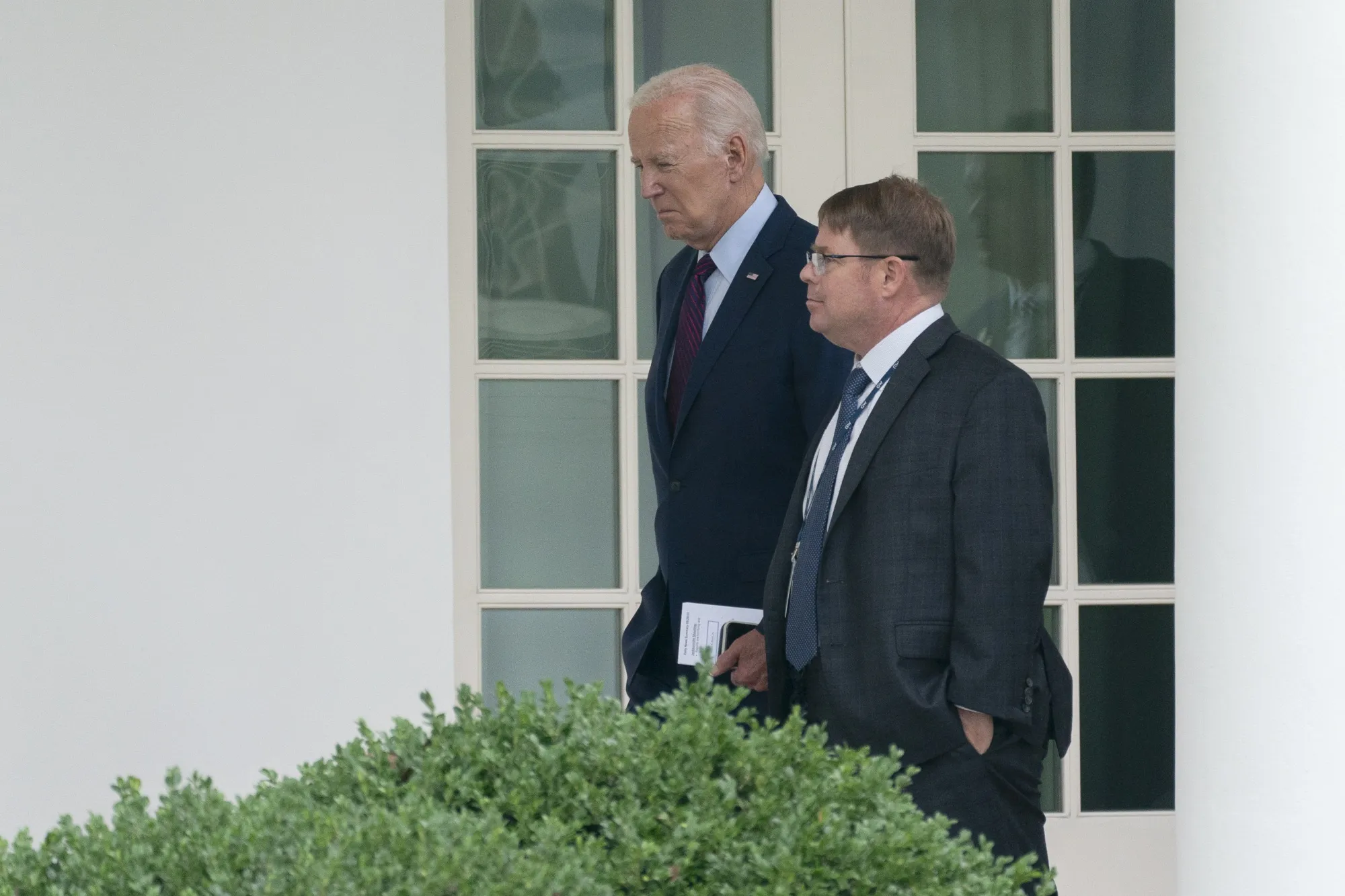2023年8月28日,喬·拜登總統與醫生凱文·奧康納在白宮柱廊同行。