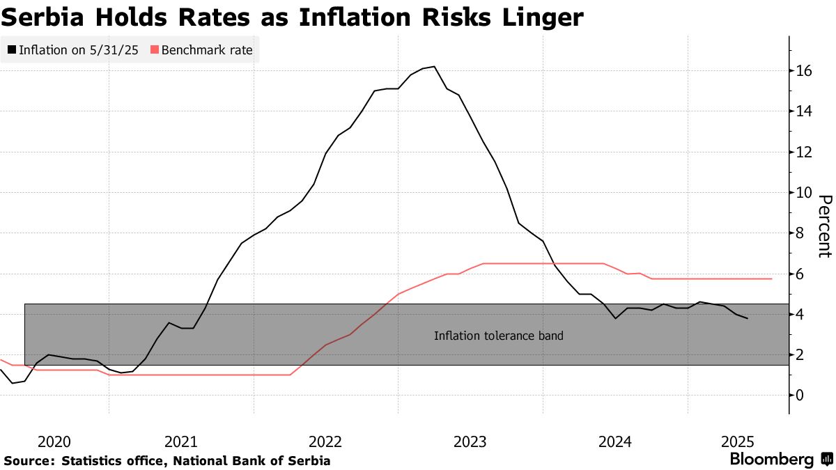 塞爾維亞國家銀行週四將一週回購利率維持在5.75%。這一決定與彭博社調查中17位經濟學家中8位的預測一致,而微弱多數預期會降息25個基點。