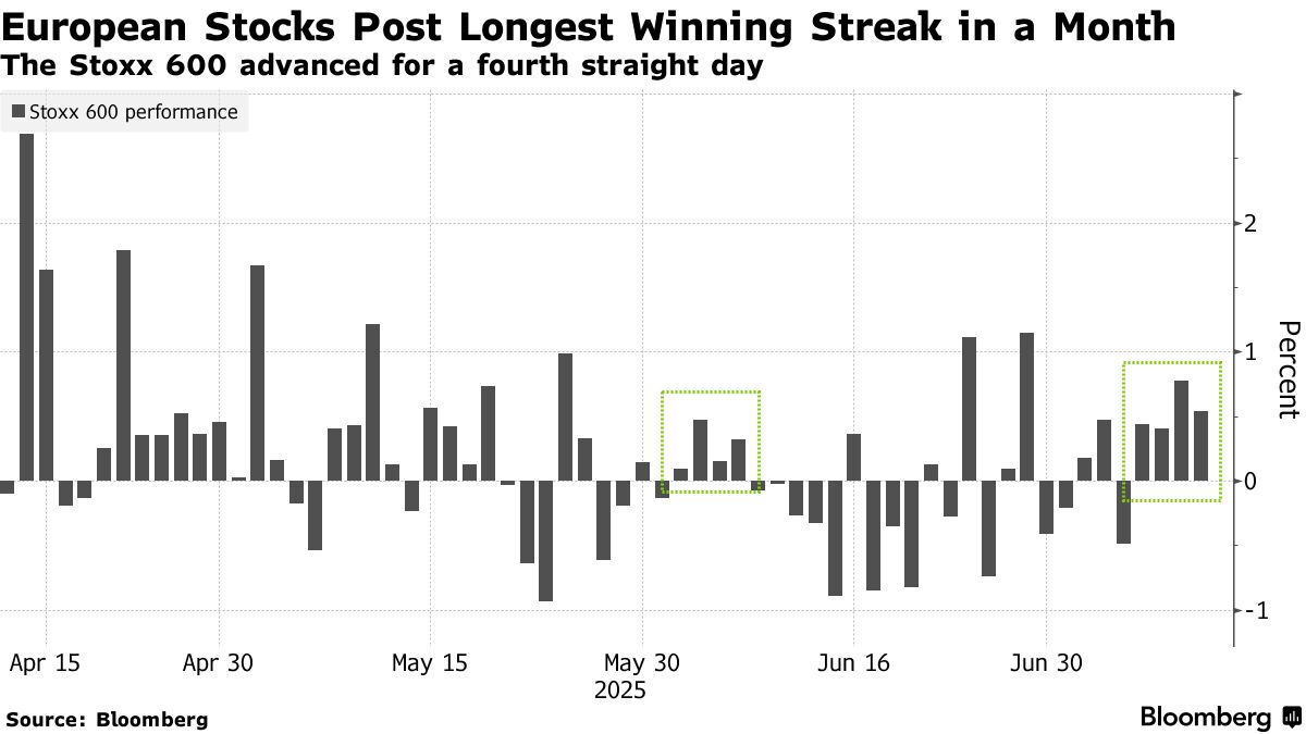 隨着投資者對美國貿易談判轉趨樂觀,歐洲股市本週持續反彈,基準指數較3月創下的歷史高點僅低1.8%。投資者正從金融類股等贏家板塊撤出,轉而大舉押注經濟週期性板塊及其他高風險策略。
