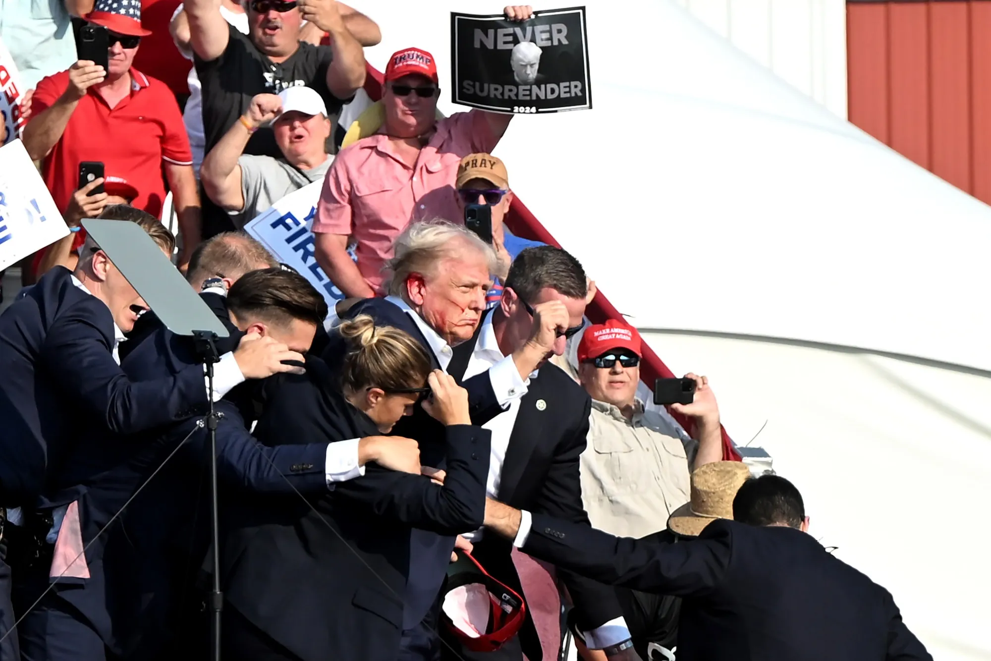 2024年7月13日,賓夕法尼亞州巴特勒市巴特勒農場展覽公司競選活動期間,唐納德·特朗普被特勤局特工包圍。