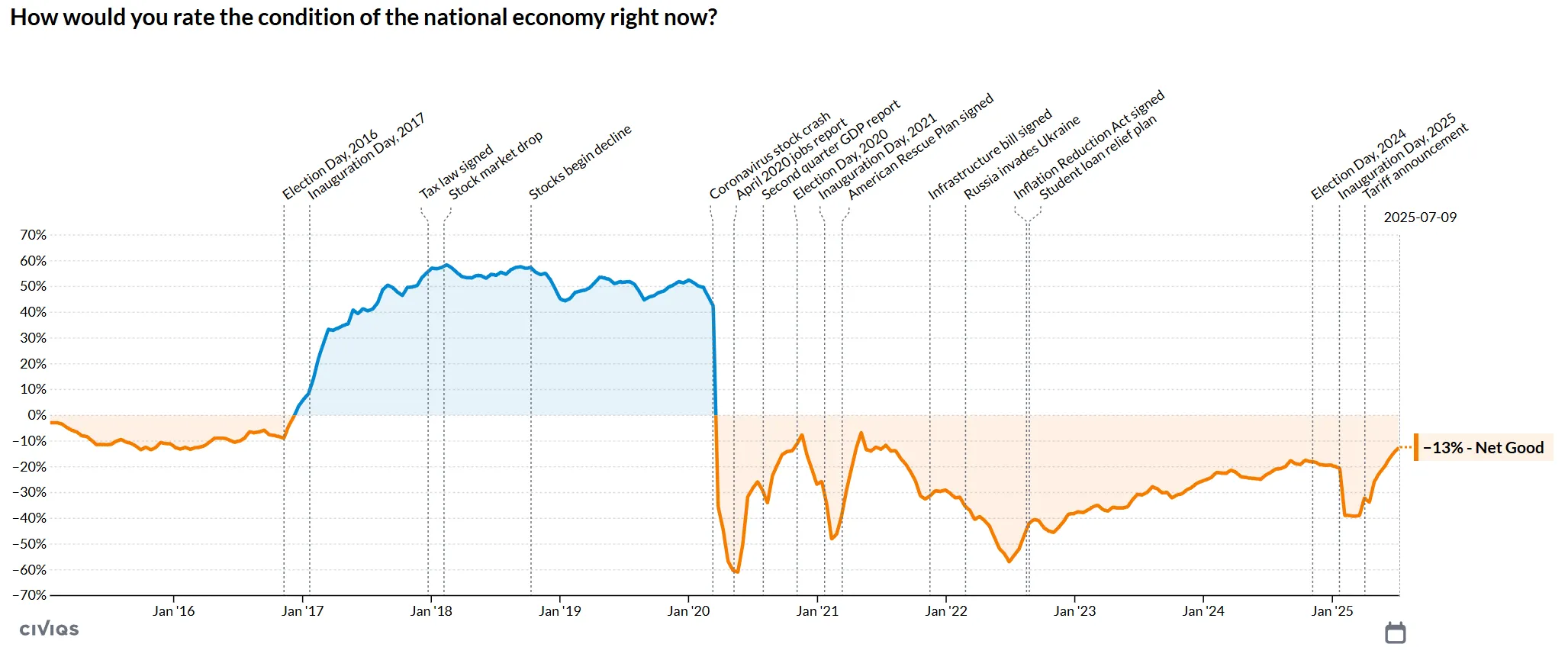 根據 Civiqs的持續在線大規模調查顯示,儘管整體仍為負面,但當前對經濟的看法已達到近年來的最高水平。