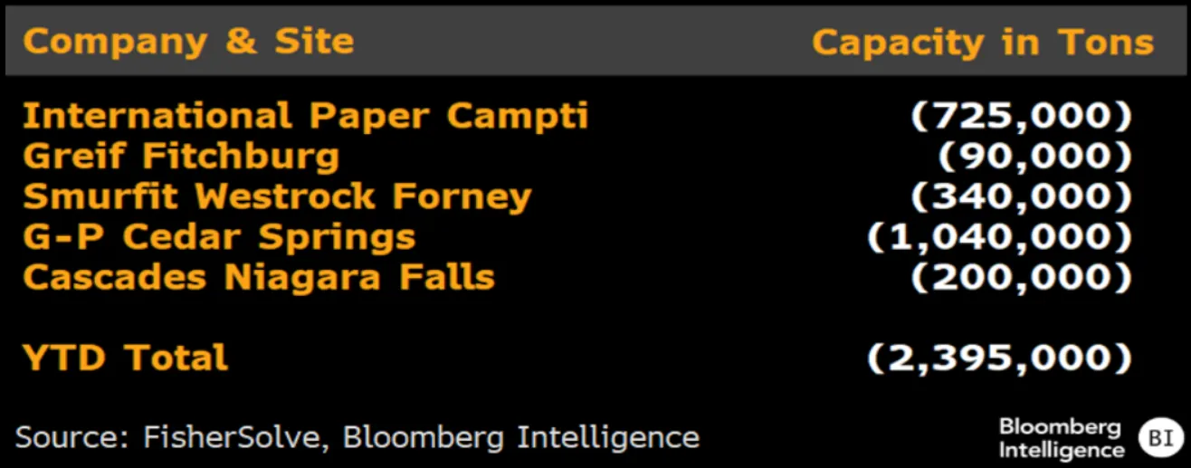 彭博智庫策略師兼全能紙箱專家瑞安·福克斯估計,這將使美國再減少20萬噸紙箱產能,使今年總損失接近240萬噸。從歷史背景來看,這個數字非常龐大。即使在2009年金融危機最嚴重時期,我們也沒見過如此大規模的停產(當年瓦楞紙產能減少了140萬噸)。