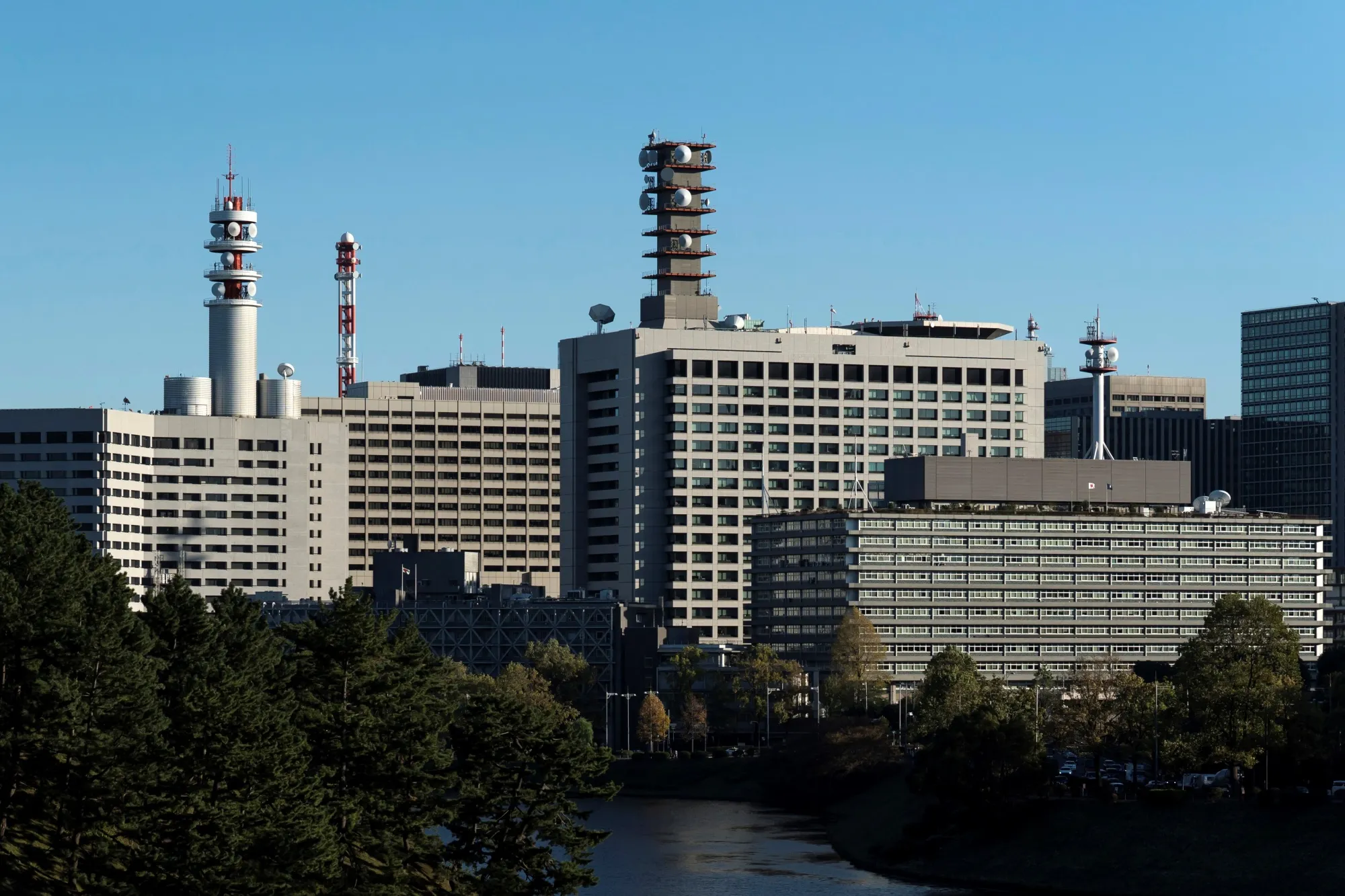向東望去,大手町與丸之內金融區已逐步發展為全球最矚目的中央商務區之一。在三菱地所株式會社主導下,該區域自1998年起已重建數十棟建築。即便是1980年建成的三菱UFJ金融集團總部等較新物業,也正為順應潮流而拆除重建,與此同時日比谷商務區也在經歷蜕變。