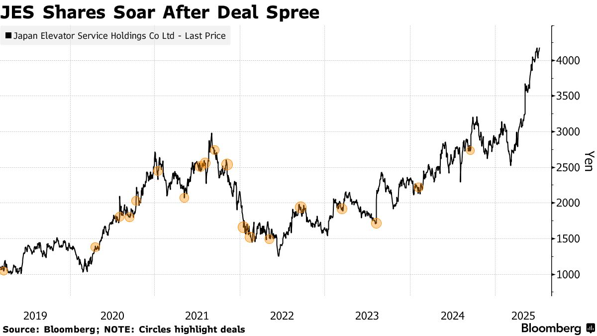 日本電梯服務控股公司將小型基礎業務整合成股市巨頭,自2017年以18億日元(當時約合1600萬美元)的較小規模首次公開募股以來,股價已飆升近6000%。上市後該公司宣佈收購了21家企業,目前市值約3720億日元(25億美元),是東證指數上市以來表現最佳的成分股之一。