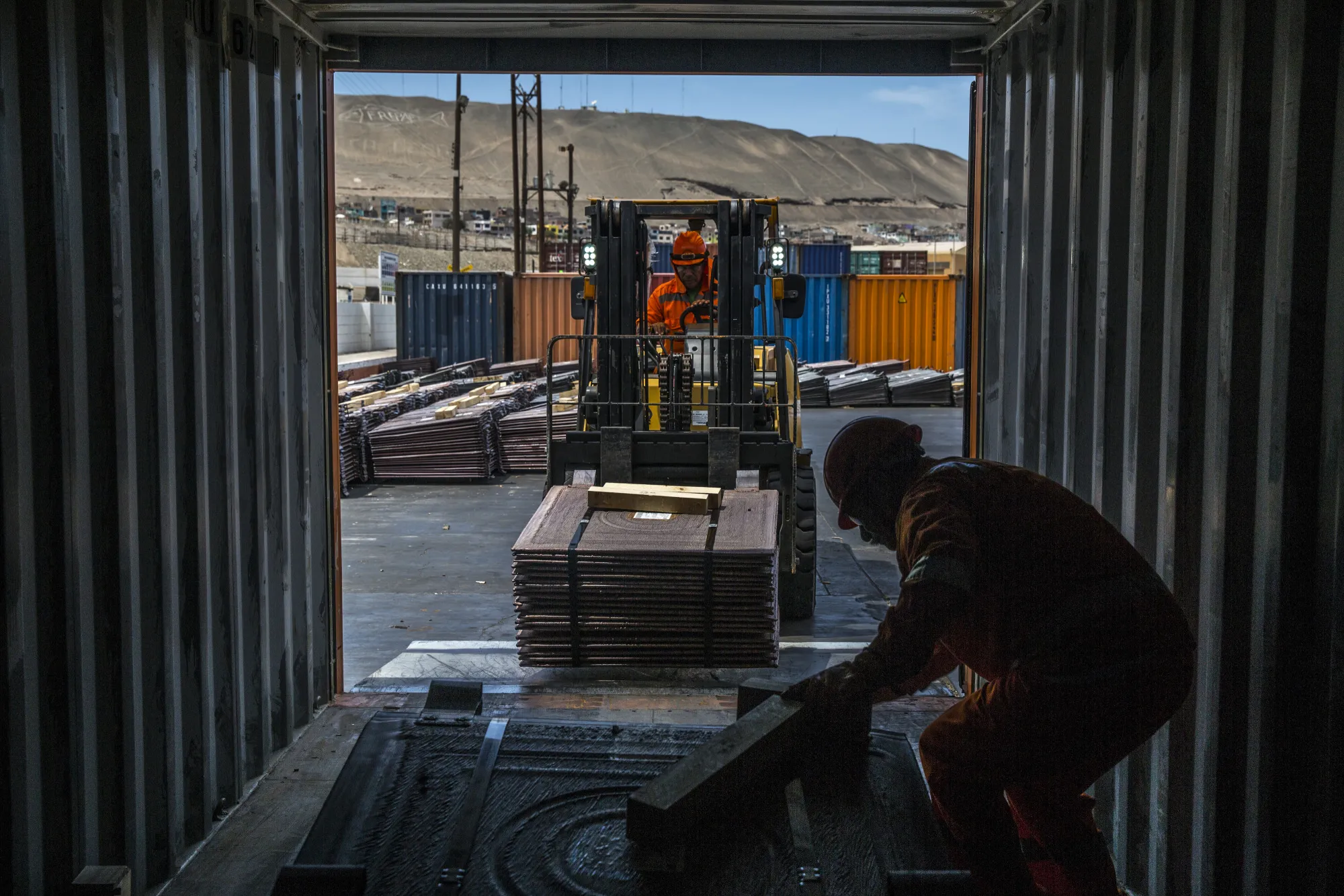 2017年,秘魯伊洛港碼頭,碼頭工人正在將銅板放置並排列到貨運集裝箱上。