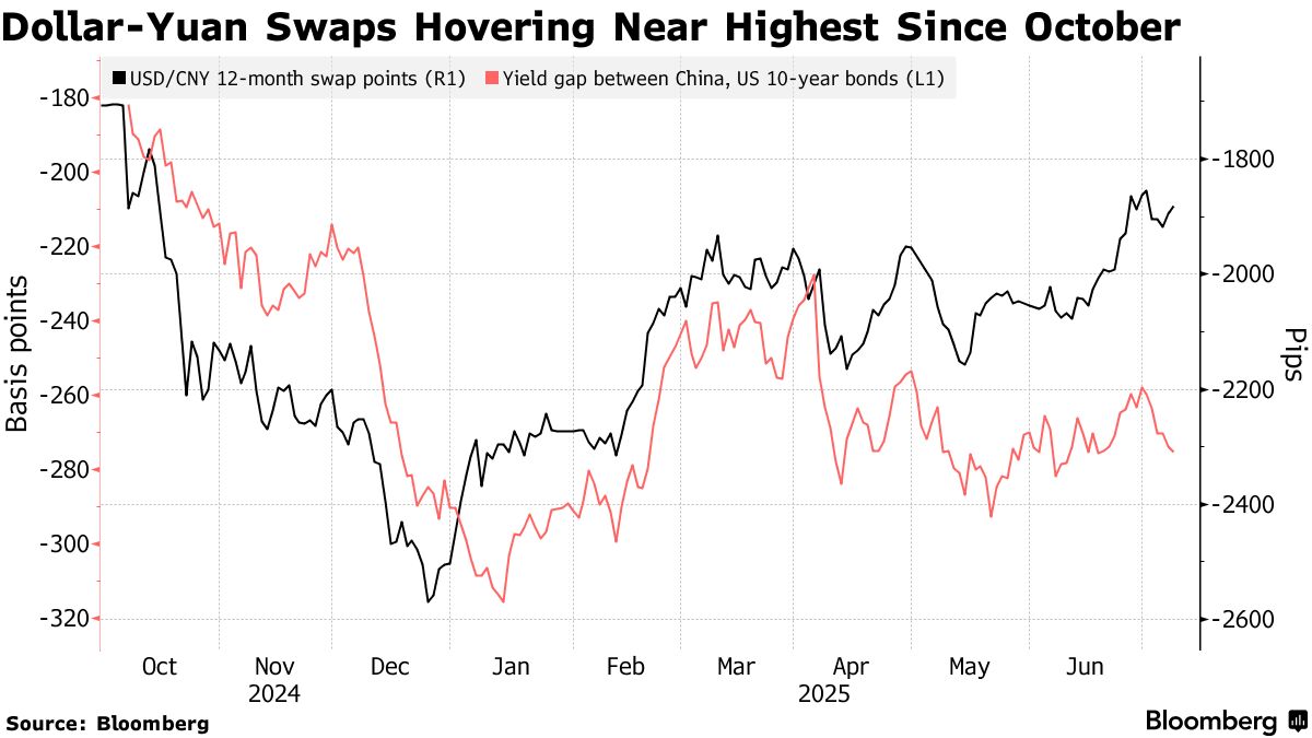 這一變化凸顯出美元走勢的轉變——由於特朗普的關税和財政政策加劇不確定性,美元上半年累計下跌10.7%——正在緩解人民幣的壓力。這為北京方面放鬆穩匯措施提供了空間。
