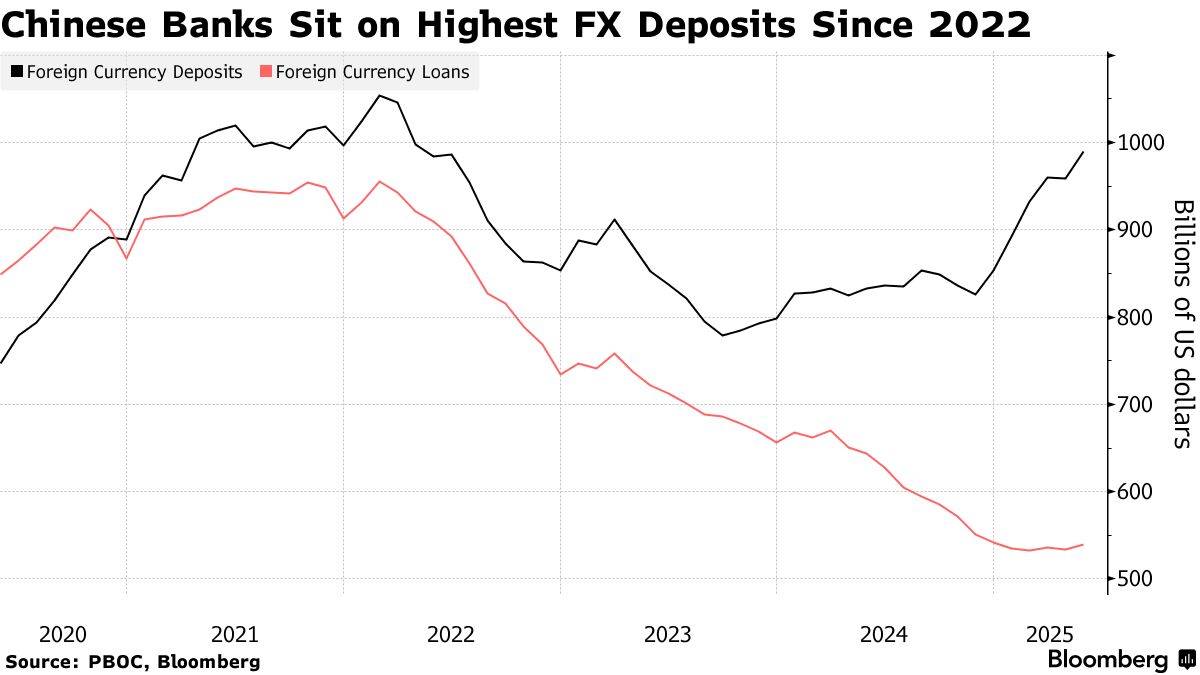 花旗集團策略師指出,中國外幣存款目前處於約三年來的高位,表明美元儲備充足。策略師Rohit Garg和Philip Yin在近期報告中寫道,部分企業可能已償還外幣貸款,使銀行得以積累更多美元。而這些更大的存款池往往與美元-人民幣互換點數的上升同步。