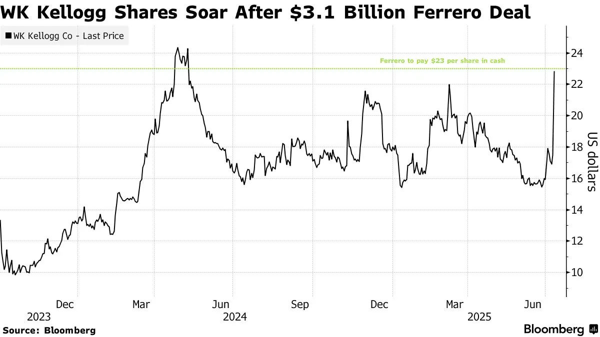 費列羅集團以31億美元收購WK家樂氏,在可可價格高企之際進一步拓展美國市場,實現巧克力之外的產品多元化。此次交易將能多益醬製造商與水果麥圈、糖霜玉米片的母公司聯合,促使家樂氏股價飆升。