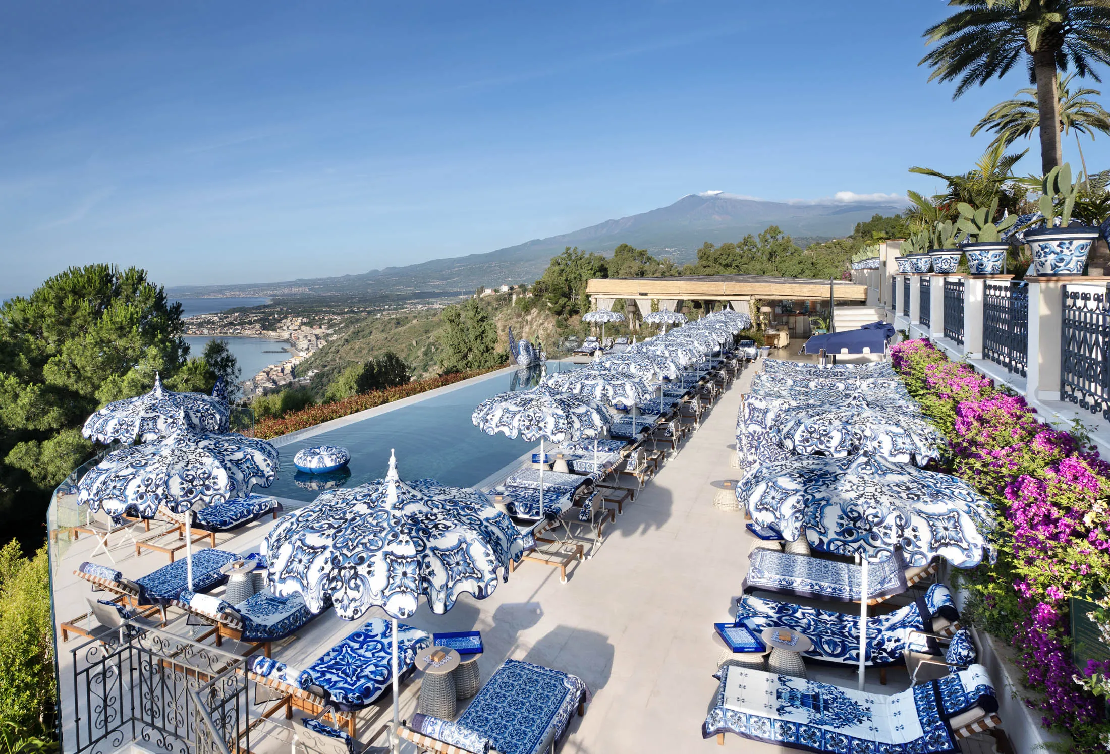 杜嘉班納(D&G)醒目的藍色印花已席捲陶爾米納聖多梅尼科宮四季酒店的泳池。圖片來源:四季酒店這是(極度)高調的奢華——這股風潮正在幾乎所有夏季熱門目的地的酒店上演,歐洲尤為突出。博柏利粗花呢裝點着薩默塞特鄉村的英國度假酒店The Newt;迪奧標誌的浮標在阿馬爾菲海岸朱美拉卡普里皇宮酒店外的水面上搖曳;米索尼條紋覆蓋了海灘度假勝地Oku Ibiza和Cali Mykonos的泳池甲板;雅克慕斯香蕉黃色的躺椅佔據了蒙特卡洛海濱浴場俱樂部的沙灘。這樣的例子不勝枚舉。