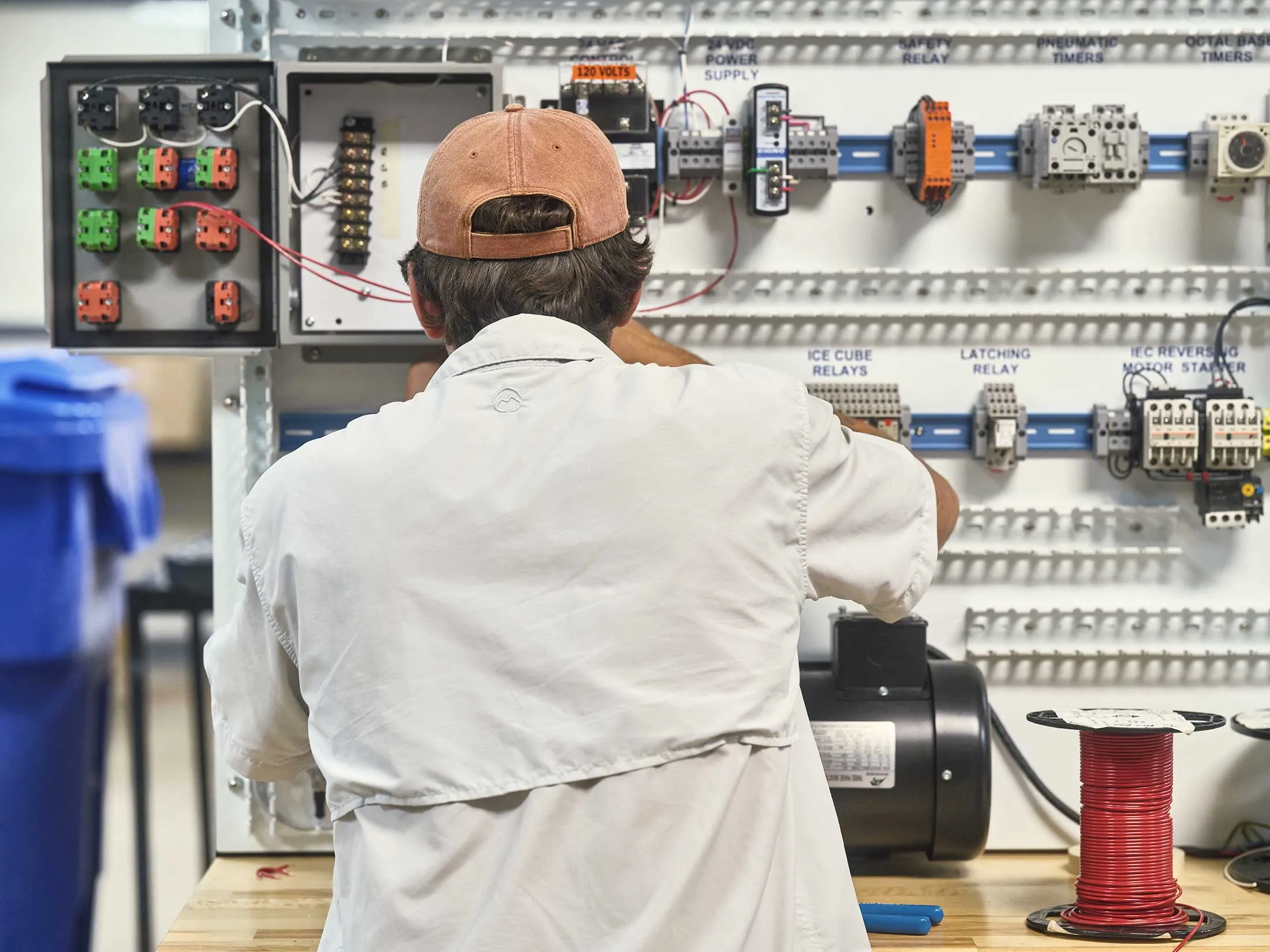 學生在電機控制課上連接電路。攝影師:安東尼·弗朗西斯為《彭博商業週刊》拍攝