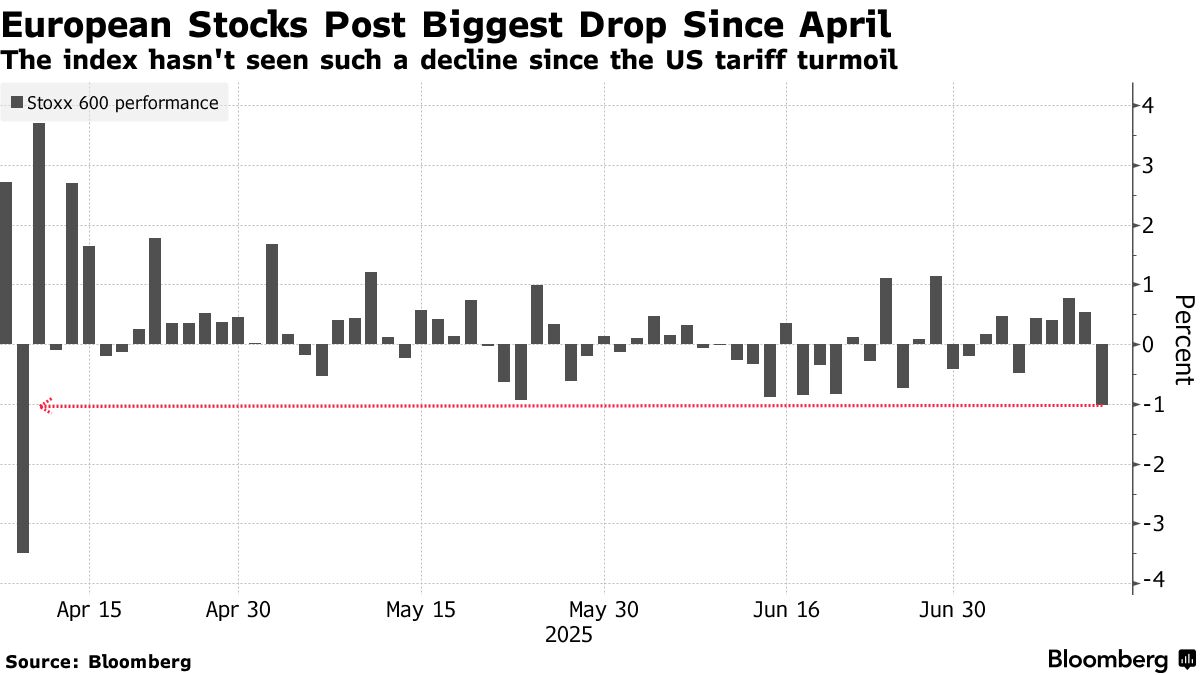 歐洲股市下跌,因美國總統特朗普升級貿易言論並威脅對多數國家全面加徵15%至20%關税。