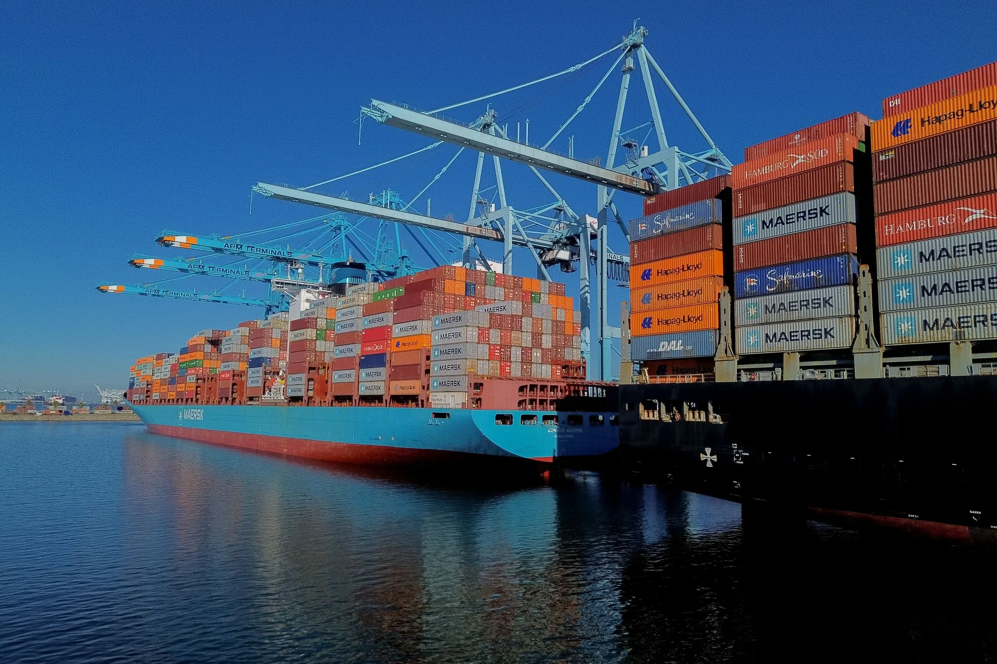 洛杉磯港APM馬士基碼頭的集裝箱船。