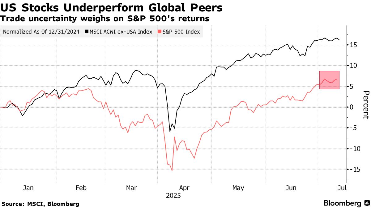 儘管特朗普承諾將對從加拿大到巴西、阿爾及利亞等所有國家加徵關税,標普500指數仍創下新高。他在接受NBC採訪時表示:“我認為關税政策反響很好。股市今天又創新高了。”