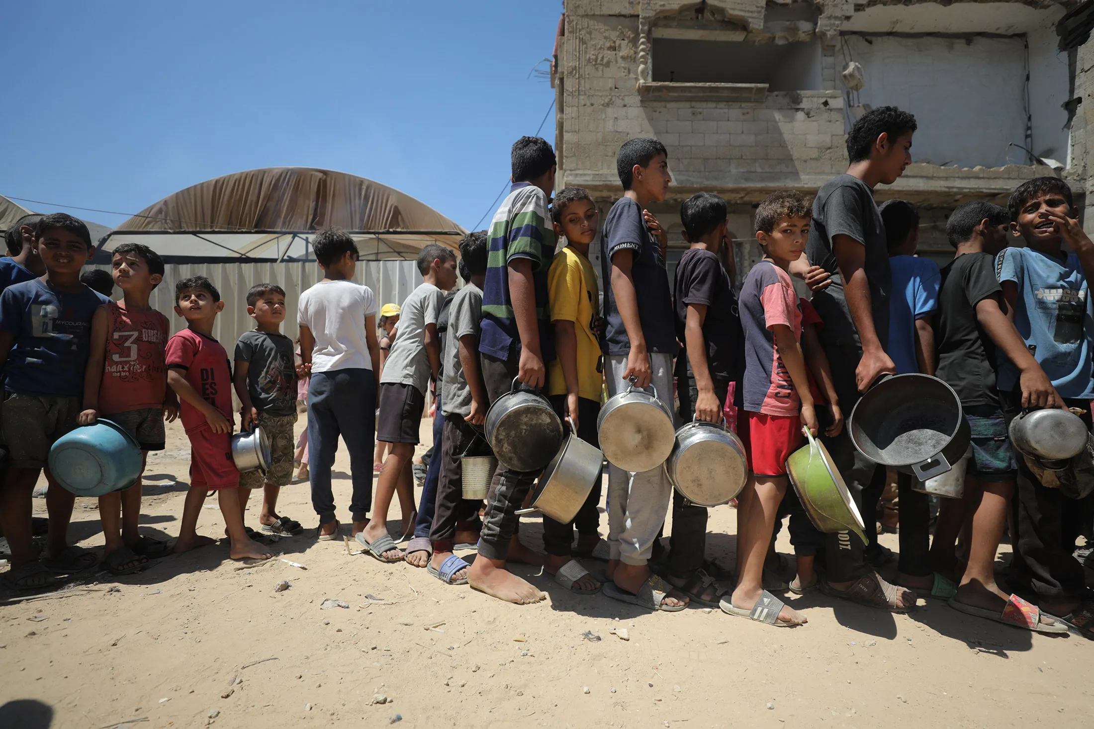 7月9日,包括許多兒童在內的巴勒斯坦人聚集在加沙地帶代爾巴拉赫,等待領取慈善組織分發的食品援助。