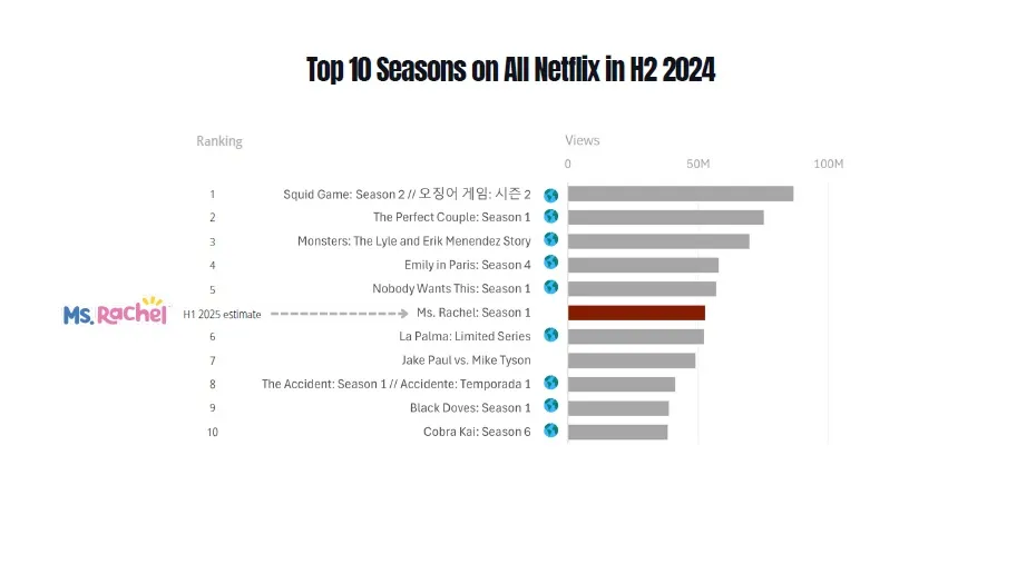 《瑞秋女士》第一季當前是網飛最受歡迎的兒童單季節目,已23次躋身平台前十榜單。