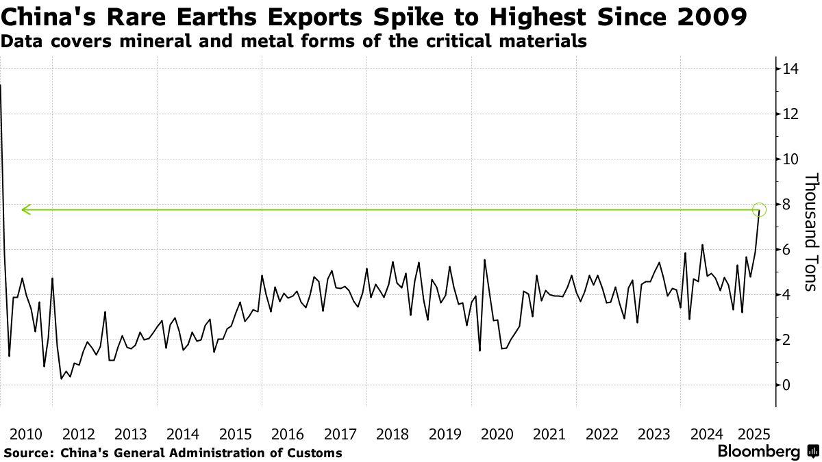 自4月初以來,稀土行業一直處於混亂狀態。當時主要供應國中國在與美國不斷升級的貿易對峙中實施了出口管制。這對所謂永磁體供應鏈造成最嚴重衝擊,而週一公佈的海關數據並未包含這類產品。
