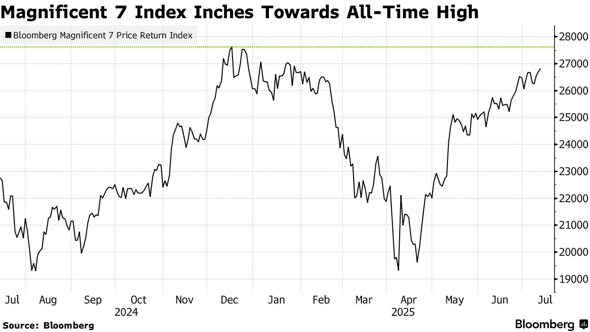 彭博社"瑰麗七雄"指數自4月低點已反彈近40%,得益於英偉達、Meta Platforms和微軟等成分股的強勁表現。這個等權重指數(還包括蘋果、Alphabet、亞馬遜和特斯拉)正逐步逼近去年12月創下的歷史高點。