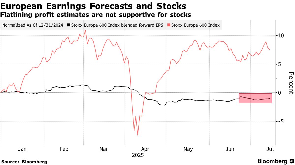隨着財報季本週開啓,投資者將密切關注企業如何應對美國關税的不確定性。彭博行業研究數據顯示,分析師預計MSCI歐洲指數成分股第二季度盈利將下滑4.8%,這將是自去年一季度以來最大跌幅。