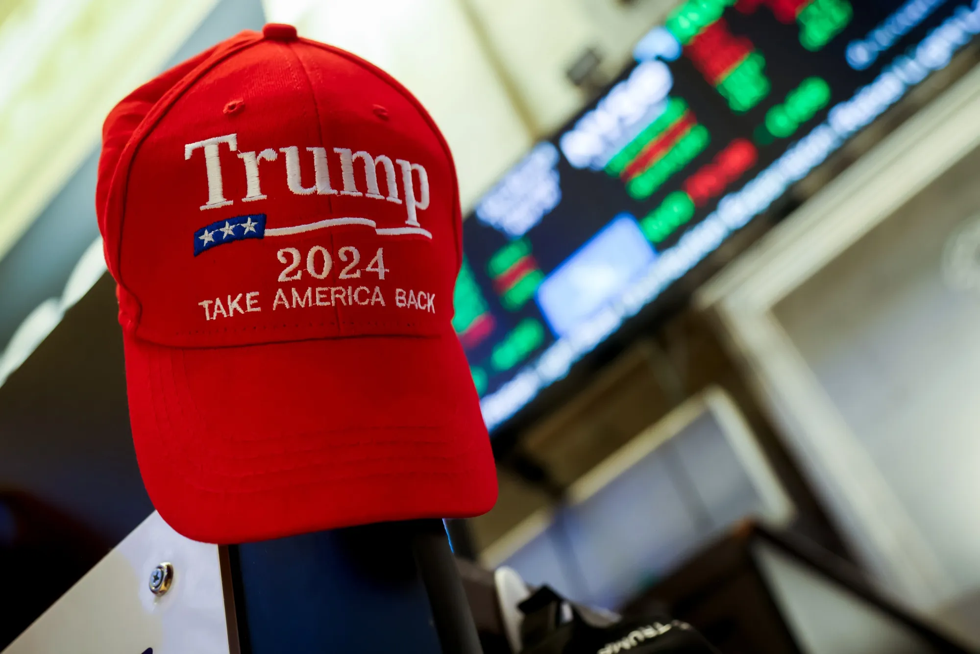 紐約證券交易所交易大廳地板上的一頂"特朗普"帽子。