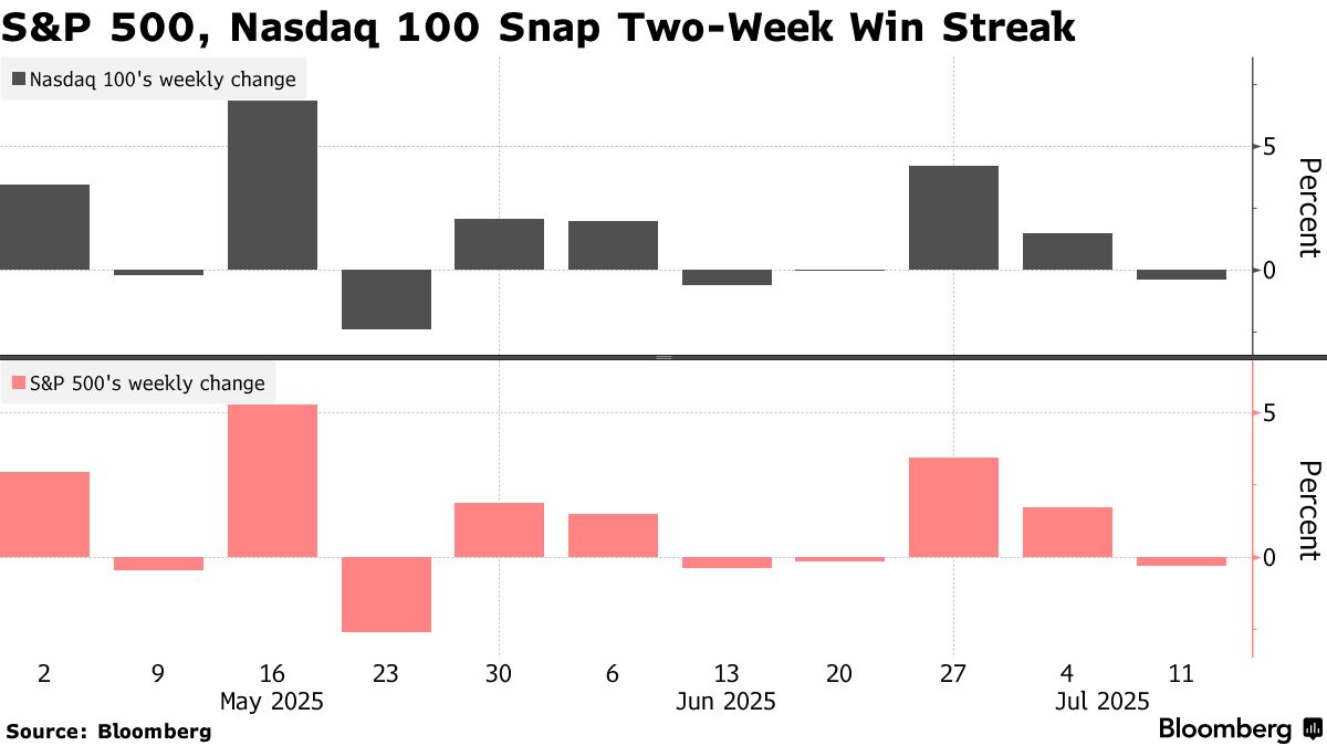 截至紐約時間上午9:45,標普500指數下跌0.3%,此前兩週連漲勢頭中斷。這使得該基準股指較7月10日創下的歷史高點回落不足0.5%,此前曾突破6200點重要心理關口。納斯達克100指數跌幅小於0.4%。追蹤包括蘋果公司、谷歌母公司Alphabet和Meta Platforms在內的"科技七巨頭"股票籃子下跌0.3%。