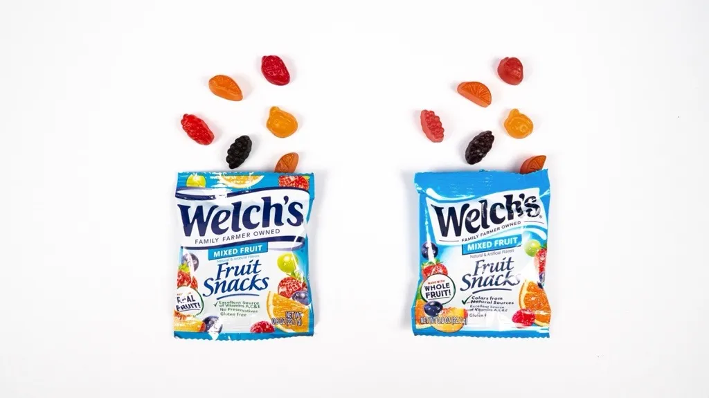 左側為使用合成染料的Welch’s水果零食,右側為使用天然染料的版本。來源:PIM BrandsWelch’s水果零食將於2026年初前全面停用合成染料**,** 母公司PIM Brands Inc. 宣佈,這使其成為最新承諾淘汰人工色素的美國品牌。