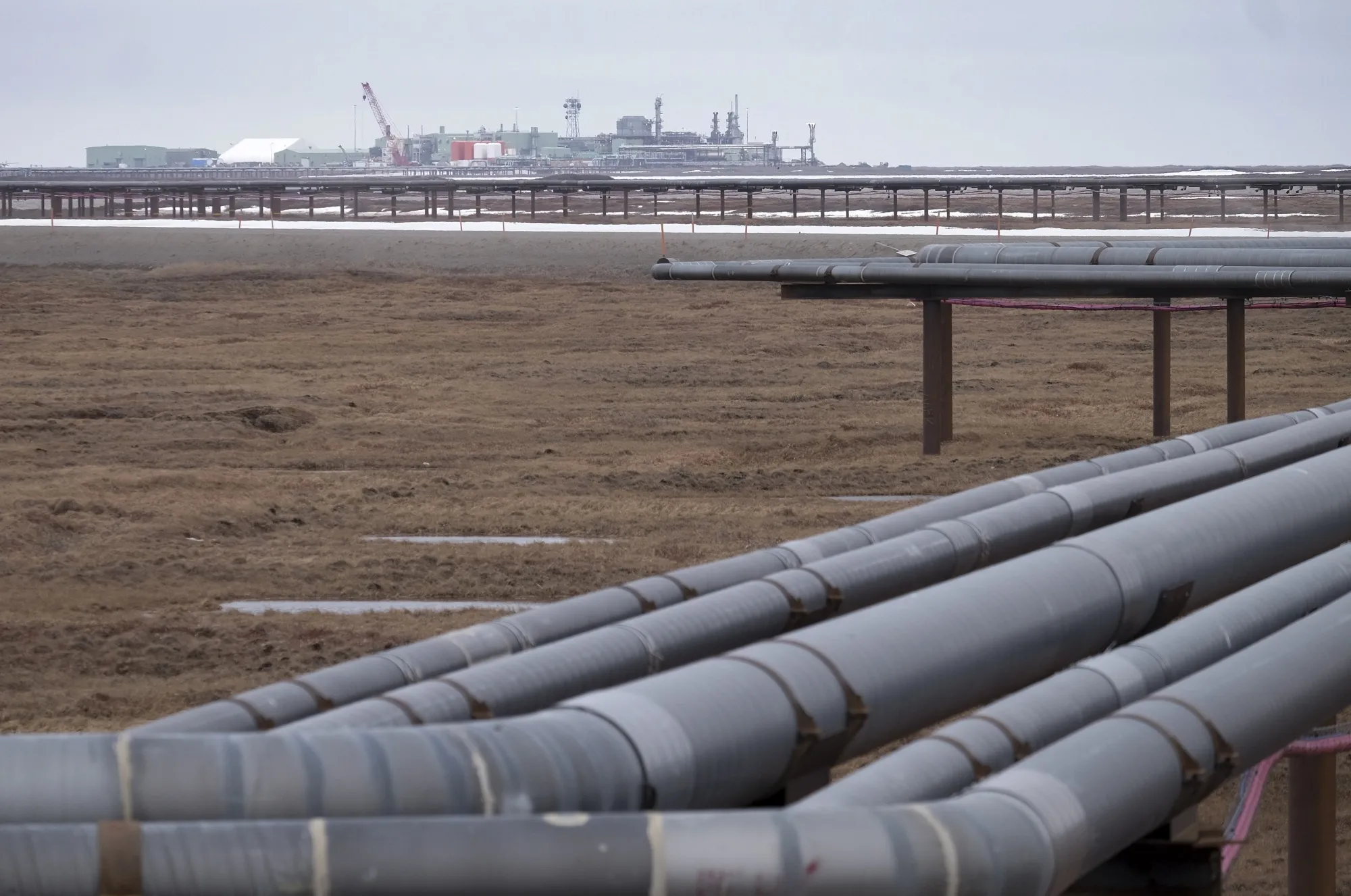 阿拉斯加努伊克蘇特附近的輸油管道,康菲石油公司在此運營阿爾派恩油田。攝影師:邦妮·喬·芒特/《華盛頓郵報》/蓋蒂圖片社該公司申請建造81英里的冰路和另外122英畝的冰面平台——均為臨時設施——用於工人營地和設備安置。臨時冰面跑道將允許每週約五班次的航班起降。