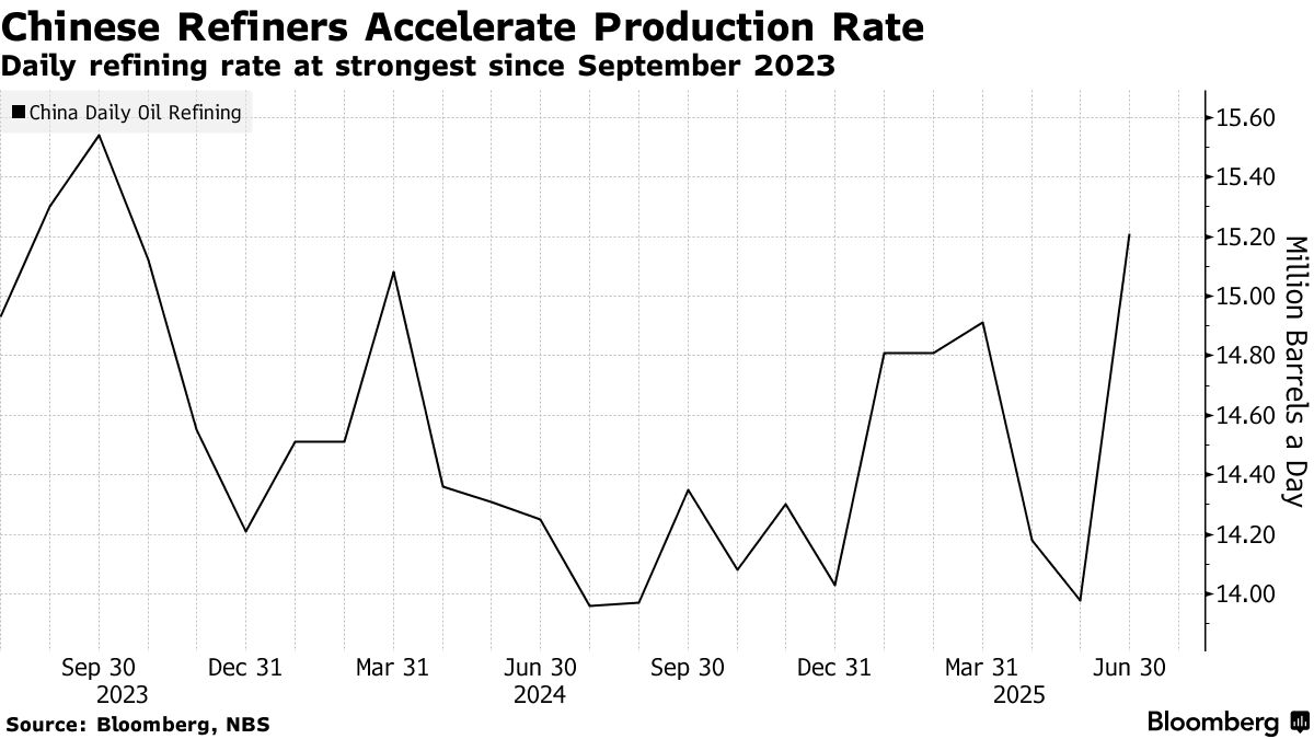 根據彭博基於統計局週二公佈數據的計算,原油日加工量攀升至逾1520萬桶,為2023年9月以來最高水平。與去年6月相比,加工量激增8.5%,扭轉了4月和5月的下滑趨勢。
