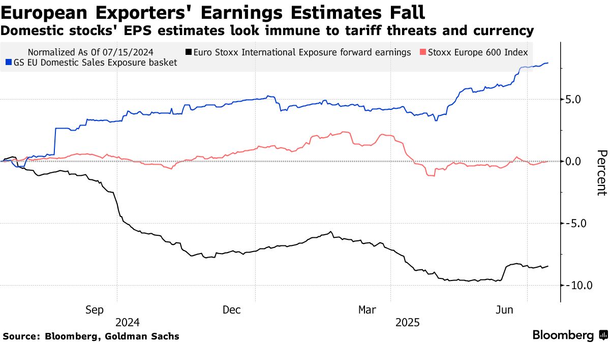 策略師們指出,賣方分析師預計斯托克600指數每股收益將同比下降3%,創下五個季度以來最大跌幅。美國銀行團隊表示,首要原因是需求疲軟對銷售額的衝擊,其次是歐元走強——4至6月期間歐元貿易加權指數同比上漲3.5%,達到五個季度高點。