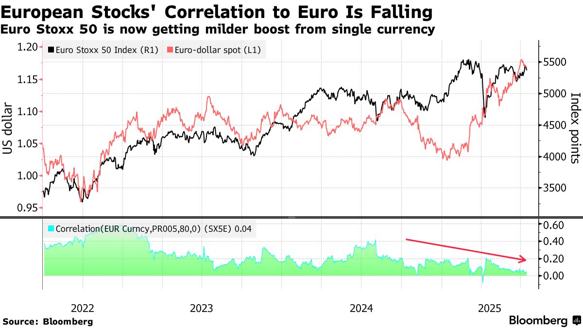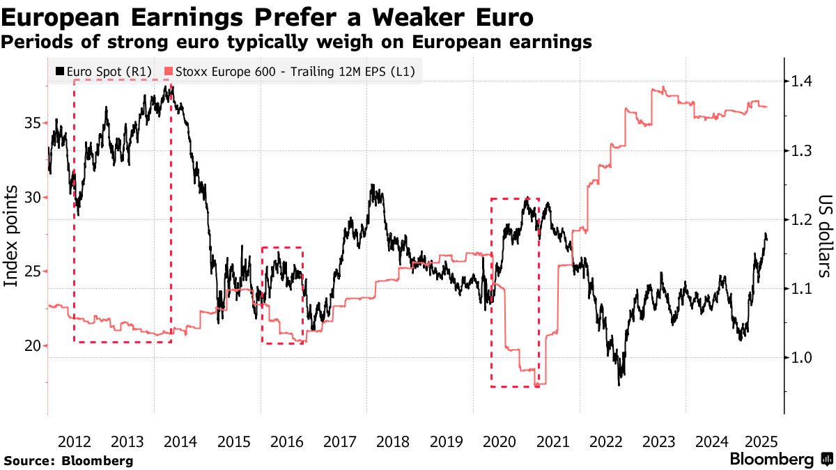 儘管歐元走強通常利好歐股,但這種相關性近期正在減弱。這表明儘管歐洲呈現經濟回暖跡象,投資者已開始意識到企業盈利面臨更大挑戰。