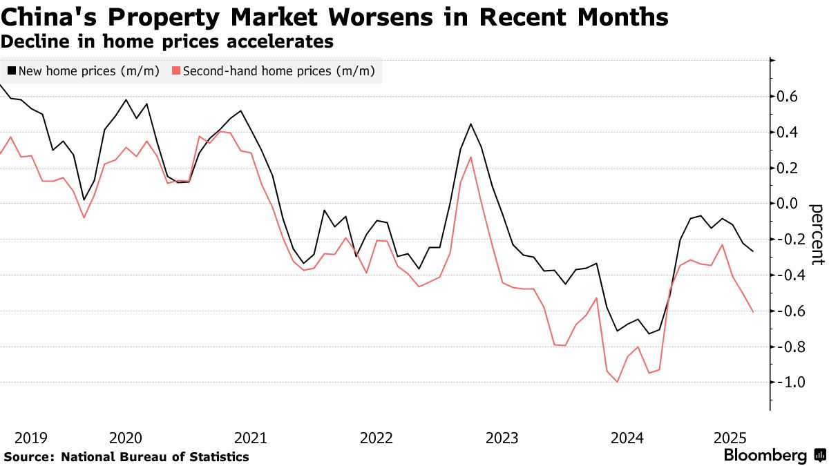 除工業產能外,經濟學家認為未來數月政策將重點扶持低迷的房地產業。6月房價加速下跌,持續數年的市場萎縮正侵蝕居民財富並抑制消費意願。
