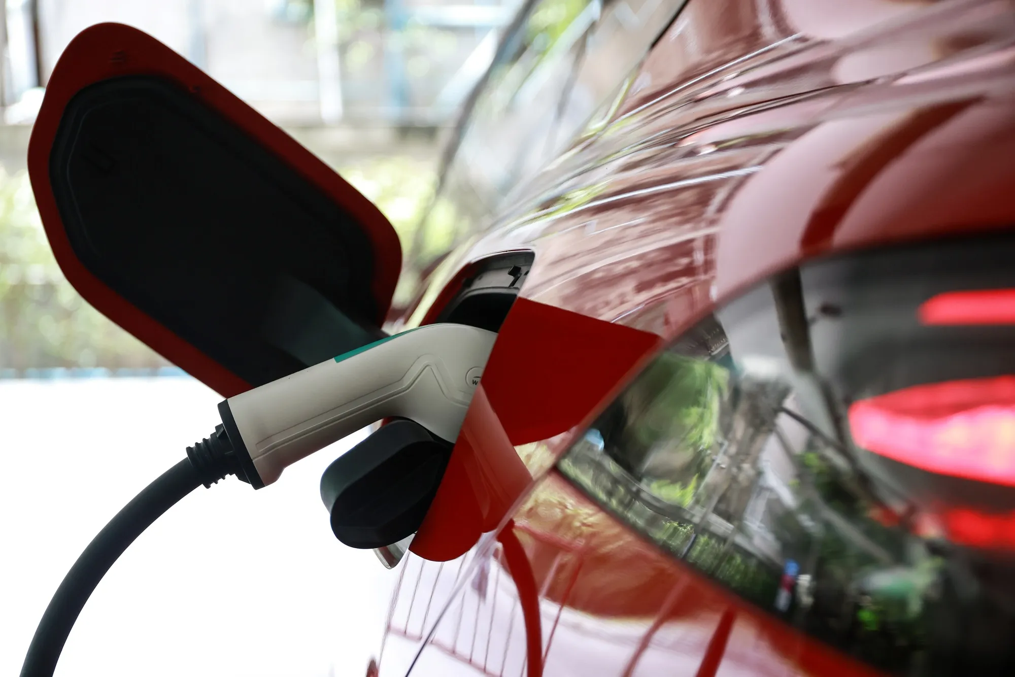 充電站內一輛電動汽車正在使用充電樁。