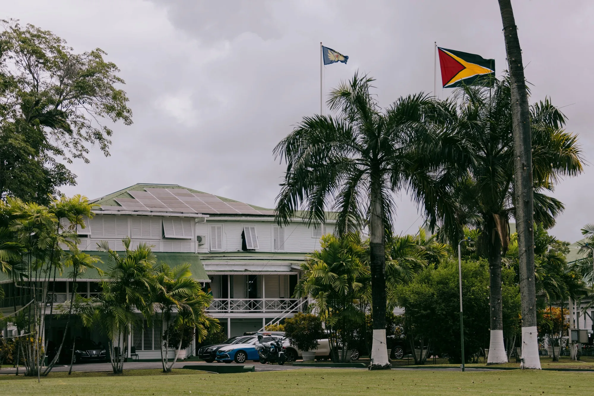 圭亞那喬治敦總統府上空的圭亞那國旗。攝影師:何塞·A·阿爾瓦拉多 Jr./彭博社一位因涉嫌黃金出口逃税而受到美國製裁的圭亞那富商,正式宣佈參選這個石油資源豐富的南美國家的領導人。
