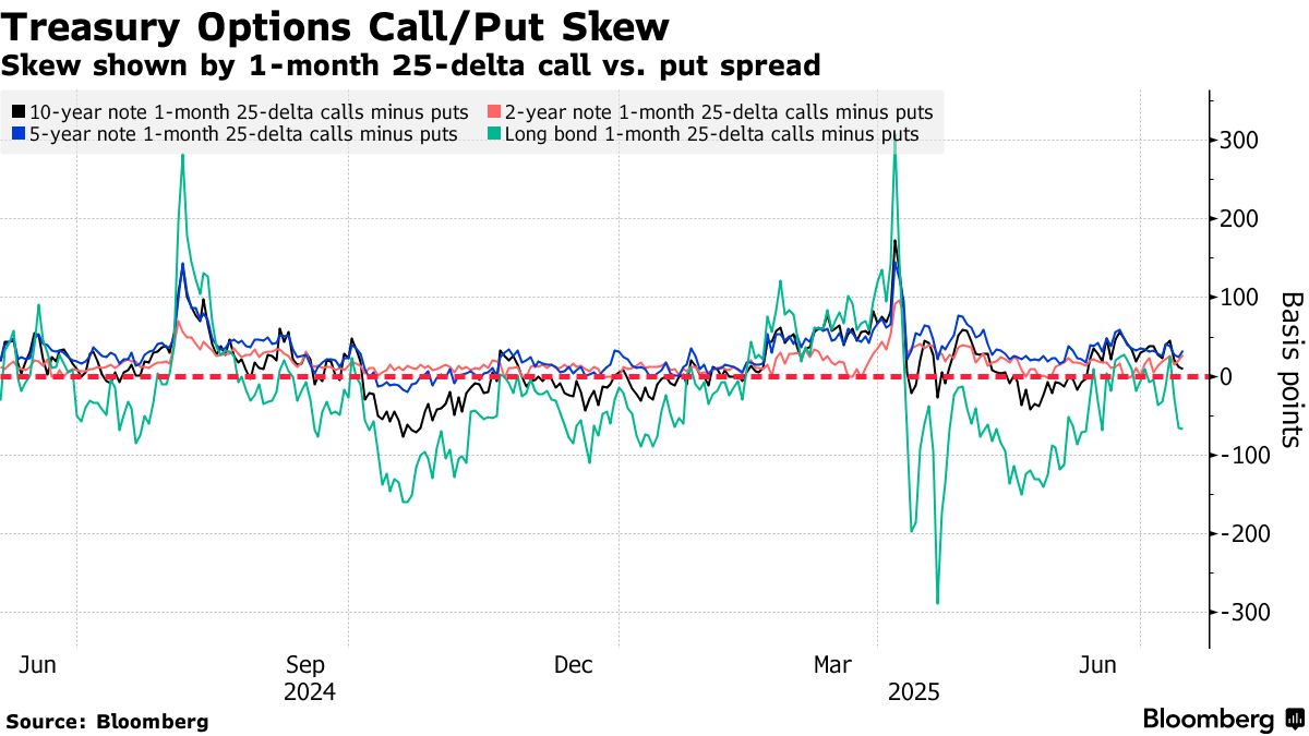期權市場還釋放出其他看跌信號。過去一週,隨着投資者要求增加對收益率上升和長期債券更大規模拋售的保護,30年期國債的所謂偏斜度急劇轉向看跌期權溢價。這使得長期債券期權看跌的傾向達到約一個月來的最高水平。