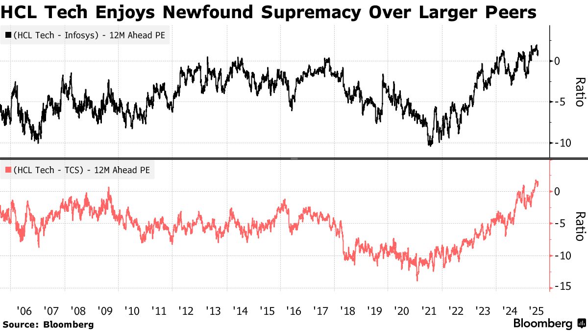 HCL科技可能公佈的第一季度業績弱於預期,但仍有理由保持樂觀。根據傑富瑞的數據,該公司新晉成為IT行業收入最高的企業,這可能有助於其保持對印孚瑟斯和塔塔諮詢服務等更大競爭對手的估值溢價。此外,HCL已將2026財年的增長預期上調至3%-5%,傑富瑞補充説,這是印度五大IT服務公司中最高的。