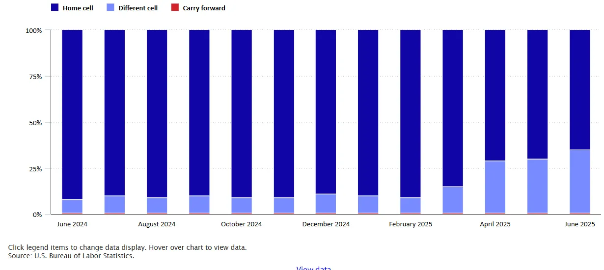 數據來源:美國勞工統計局數據來源:美國勞工統計局這張圖揭示的是美國勞工統計局通過估算得出的CPI價格佔比。重點關注淺藍色區塊——它代表採用"異單元格估算"計算的CPI數據比例,即當統計局無法直接觀測到某項價格時採用的替代方法。