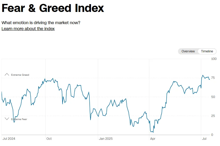 CNN商業的“恐懼與貪婪指數”是我見過最全面的此類指標。它綜合考慮了市場廣度、波動性、債券作為避險資產的相對需求,以及衍生品驅動的情緒和垃圾債券市場的動向。當前指數顯示投資者毫無懼色,事實上他們極度貪婪——追逐贏家、推高股價,彷彿前方毫無風險。