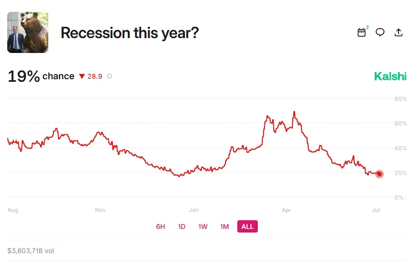 儘管如此,標普500指數已從四月低點反彈約25%,基本回歸4月2日前的趨勢線。投注平台Kalshi顯示投資者認為今年發生經濟衰退的可能性微乎其微。
