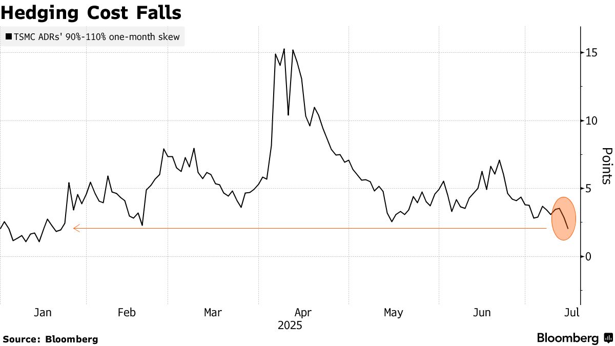 根據彭博彙編的美國流動性更強的期權交易數據顯示,相對於看漲押注,對沖該股下跌風險的成本已降至1月以來最低水平。這家全球領先的芯片代工廠上週公佈了超預期的季度營收增長,分析師預計台積電將在週四公佈詳細業績時上調全年指引,並暗示進一步提價。